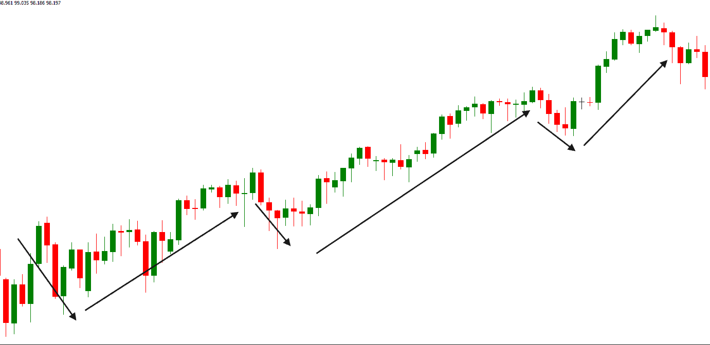 當你順勢交易時,最好在價格向相反方向小幅波動時買入。例如,在上升趨勢下,你通常會看到價格先上漲(impulse),然後有小幅下跌(retracement)。